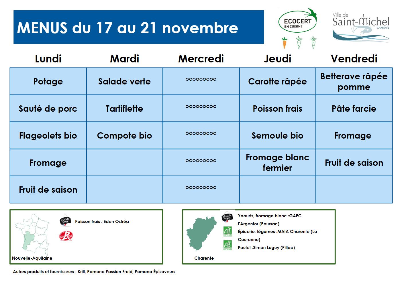 Menus Le lundi 17 Nov 2025 à 10h00 AM Les categories associées : Restauration scolaireJ’aime ma villeNos agendasDroits et DémarchesNous contacterAssociationsUrgences et GardesMenusSallesPartager :