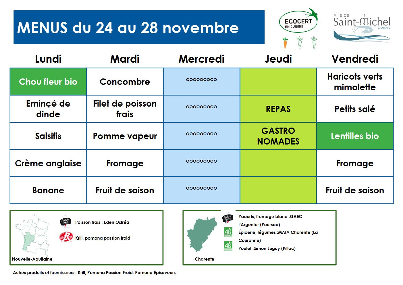 Menus Le vendredi 21 Nov 2025 à 10h00 AM Les categories associées : Restauration scolaireJ’aime ma villeNos agendasDroits et DémarchesNous contacterAssociationsUrgences et GardesMenusSallesPartager :