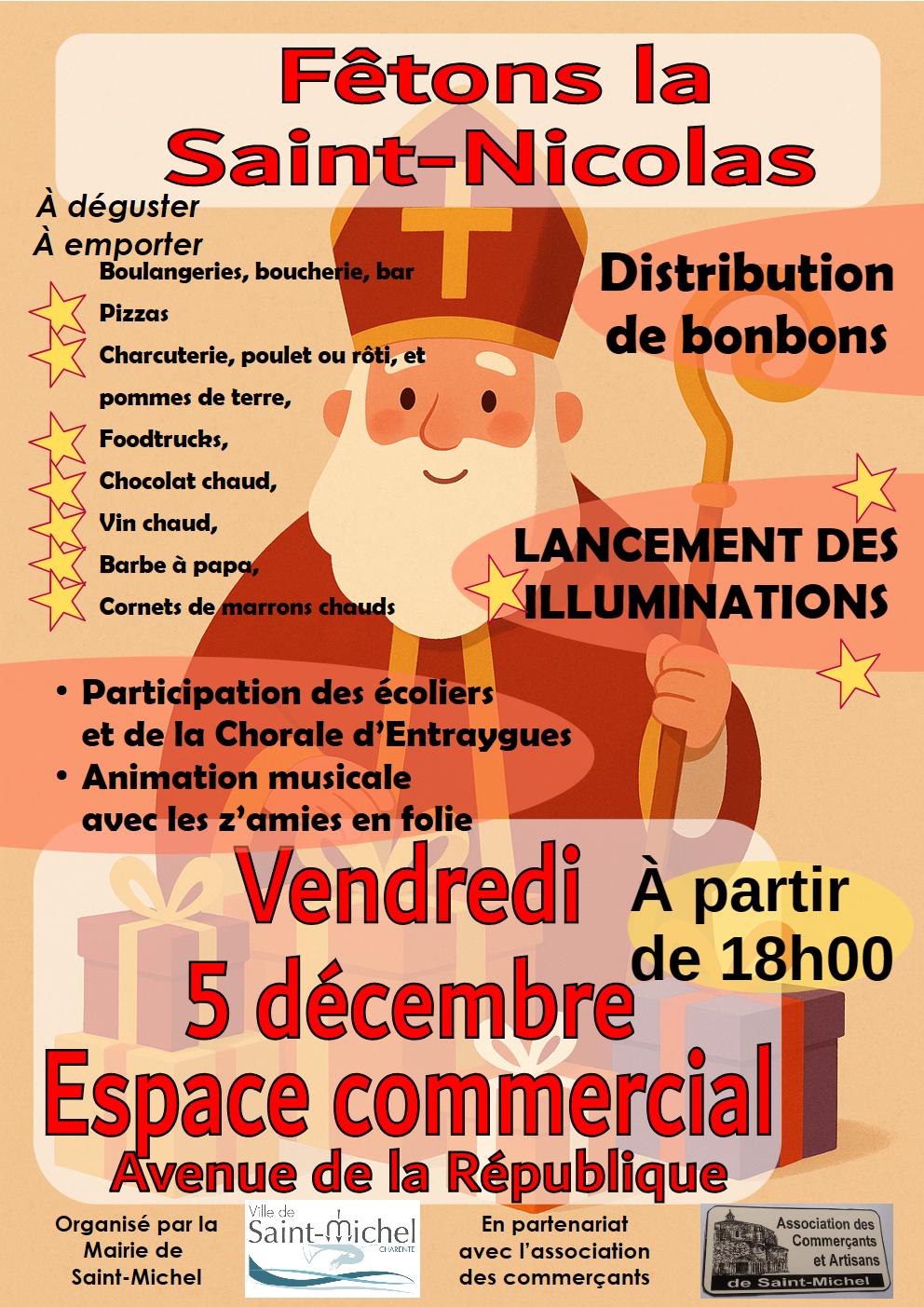 Saint-Nicolas à Saint-Michel Le mardi 25 Nov 2025 à 14h59 PM Fêtons la Saint-NicolasVendredi 05 décembre à Saint-Michel, au centre commercial, à partir de 18h00 Les categories associées : Programme culturel et animationsJ’aime ma villeNos agendasDroits et DémarchesNous contacterAssociationsUrgences et GardesMenusSallesPartager :
