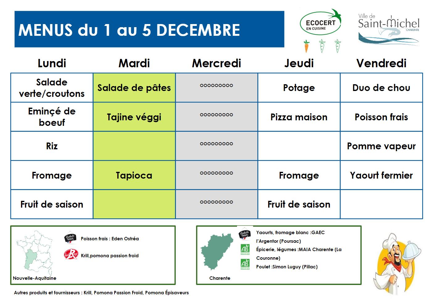Menus Le vendredi 28 Nov 2025 à 10h00 AM Les categories associées : Restauration scolaireJ’aime ma villeNos agendasDroits et DémarchesNous contacterAssociationsUrgences et GardesMenusSallesPartager :