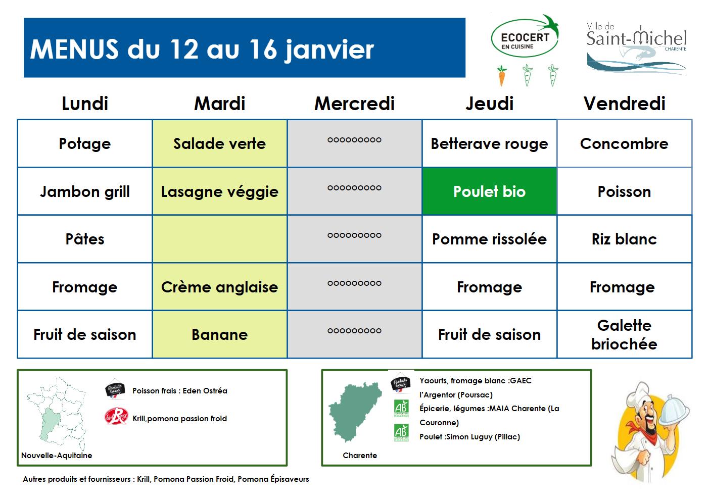 Menus Le vendredi 09 Jan 2026 à 10h00 AM Les categories associées : Restauration scolaireJ’aime ma villeNos agendasDroits et DémarchesNous contacterAssociationsUrgences et GardesMenusSallesPartager :
