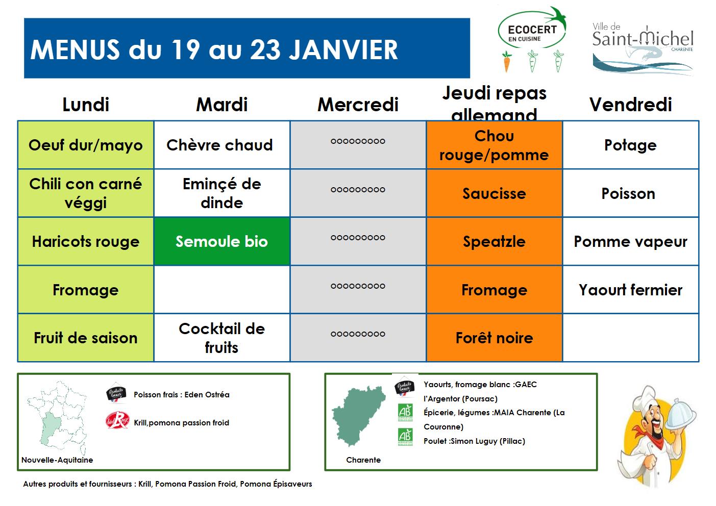 Menus Le vendredi 16 Jan 2026 à 10h00 AM Les categories associées : Restauration scolaireJ’aime ma villeNos agendasDroits et DémarchesNous contacterAssociationsUrgences et GardesMenusSallesPartager :