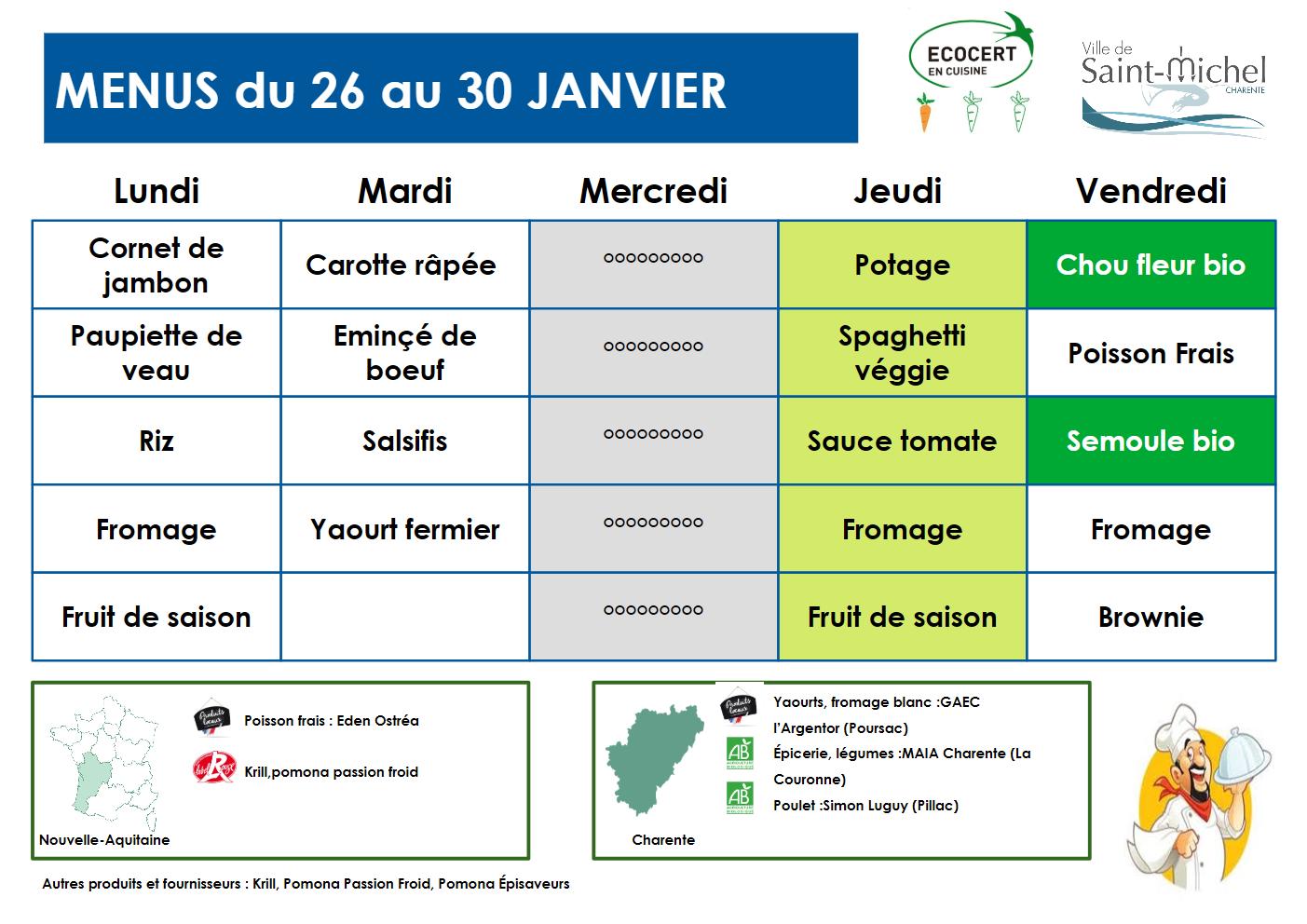 Menus Le vendredi 23 Jan 2026 à 10h00 AM Les categories associées : Restauration scolaireJ’aime ma villeNos agendasDroits et DémarchesNous contacterAssociationsUrgences et GardesMenusSallesPartager :