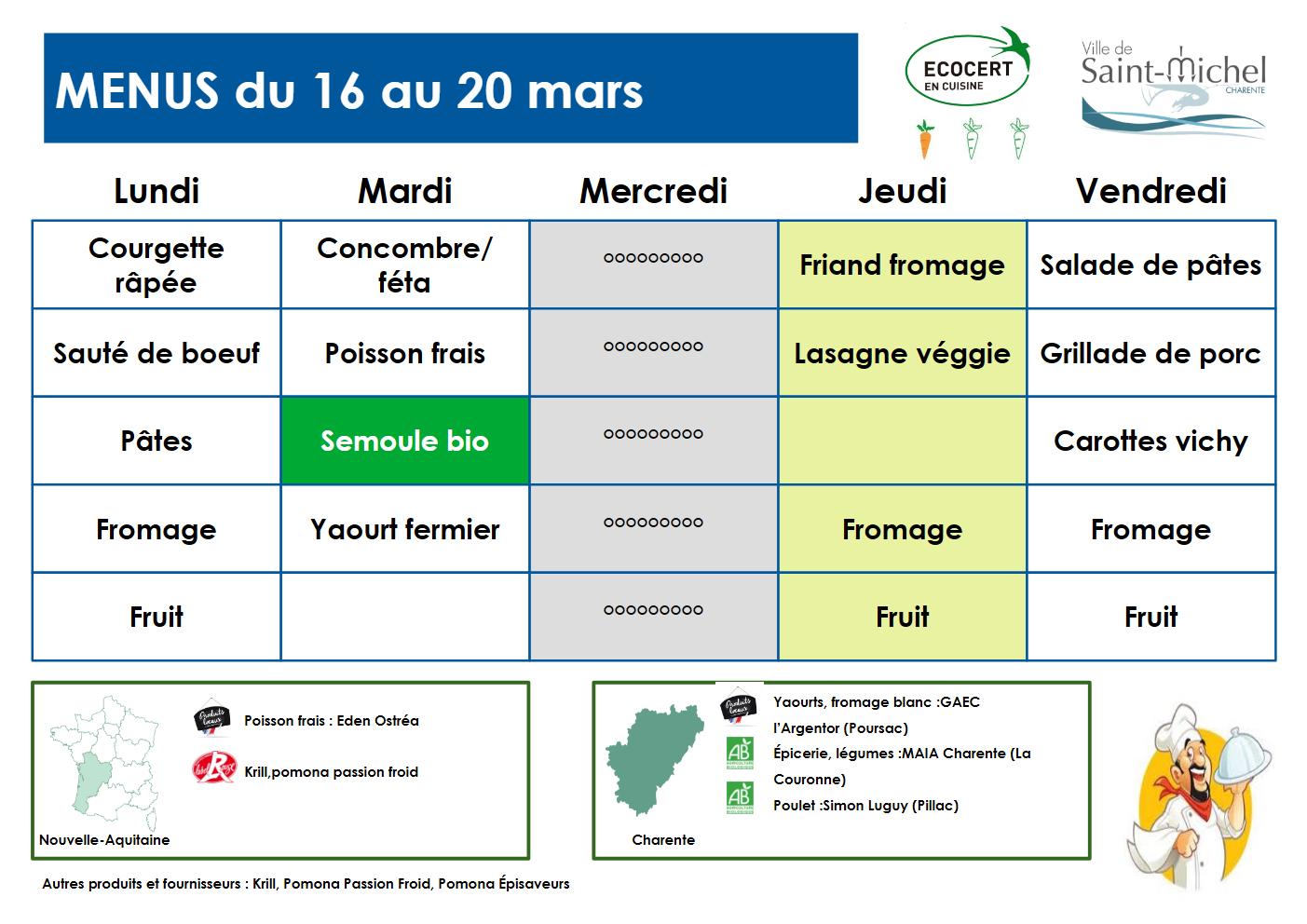 Menus Le jeudi 12 Mar 2026 à 10h00 AM Les categories associées : Restauration scolaireJ’aime ma villeNos agendasDroits et DémarchesNous contacterAssociationsUrgences et GardesMenusSallesPartager :