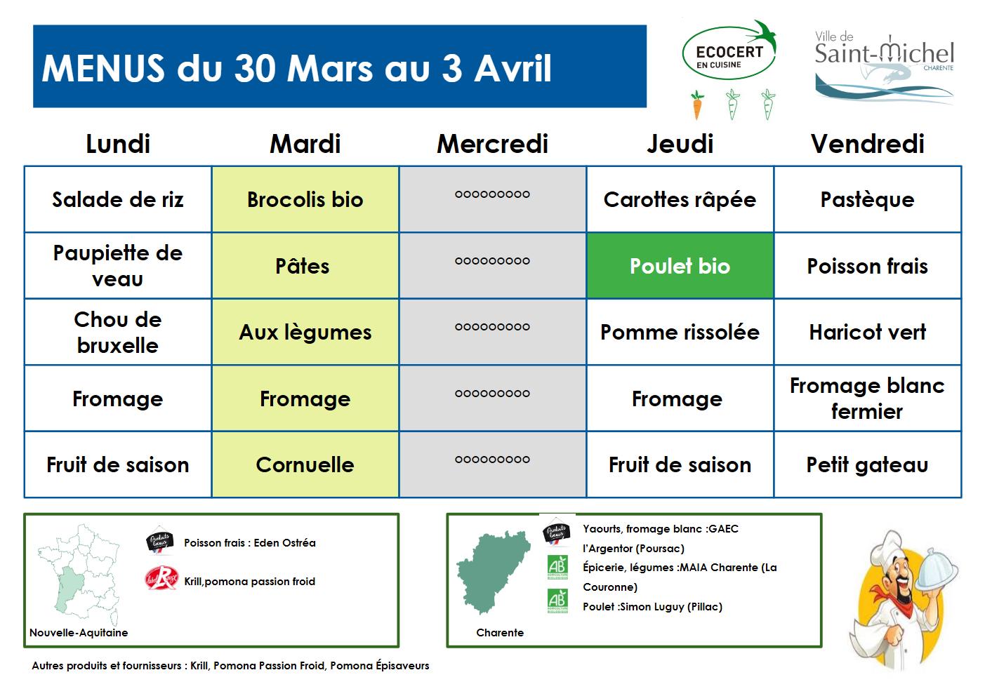 Menus Le jeudi 26 Mar 2026 à 10h00 AM Les categories associées : Restauration scolaireJ’aime ma villeNos agendasDroits et DémarchesNous contacterAssociationsUrgences et GardesMenusSallesPartager :